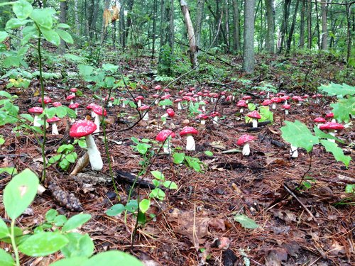 Consists of over 200 ceramic mushrooms scattered upon the underbrush on the side of a hill.